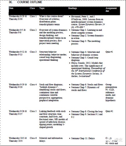 美国高校教授们则完全不一样。以我所在的华盛顿大学为例,教务系统在每个学期开学前一周左右,就会推出本学期每一门课的教学大纲(syllabus),上面会详细列出课程介绍、教学目标,以及本学期15-16次课的预习内容、课堂主题、课后作业、考试时间等等,一目了然。所有的教授都会严格遵照这个既定的方针去推进教学进程,不会轻易中途改变授课节奏和顺序,学生们可以放心地按照学期初就收到的教学大纲去规划本学期的学习。如下图,就是我们学院一门明星课程——系统动力学在2012年秋季学期的教学大纲局部: